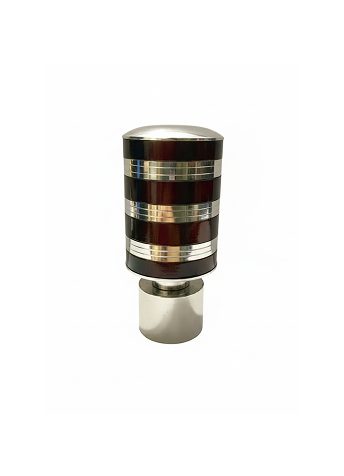 Design: Unique cylindrical shape with brown glossy layers and chrome accent rings
